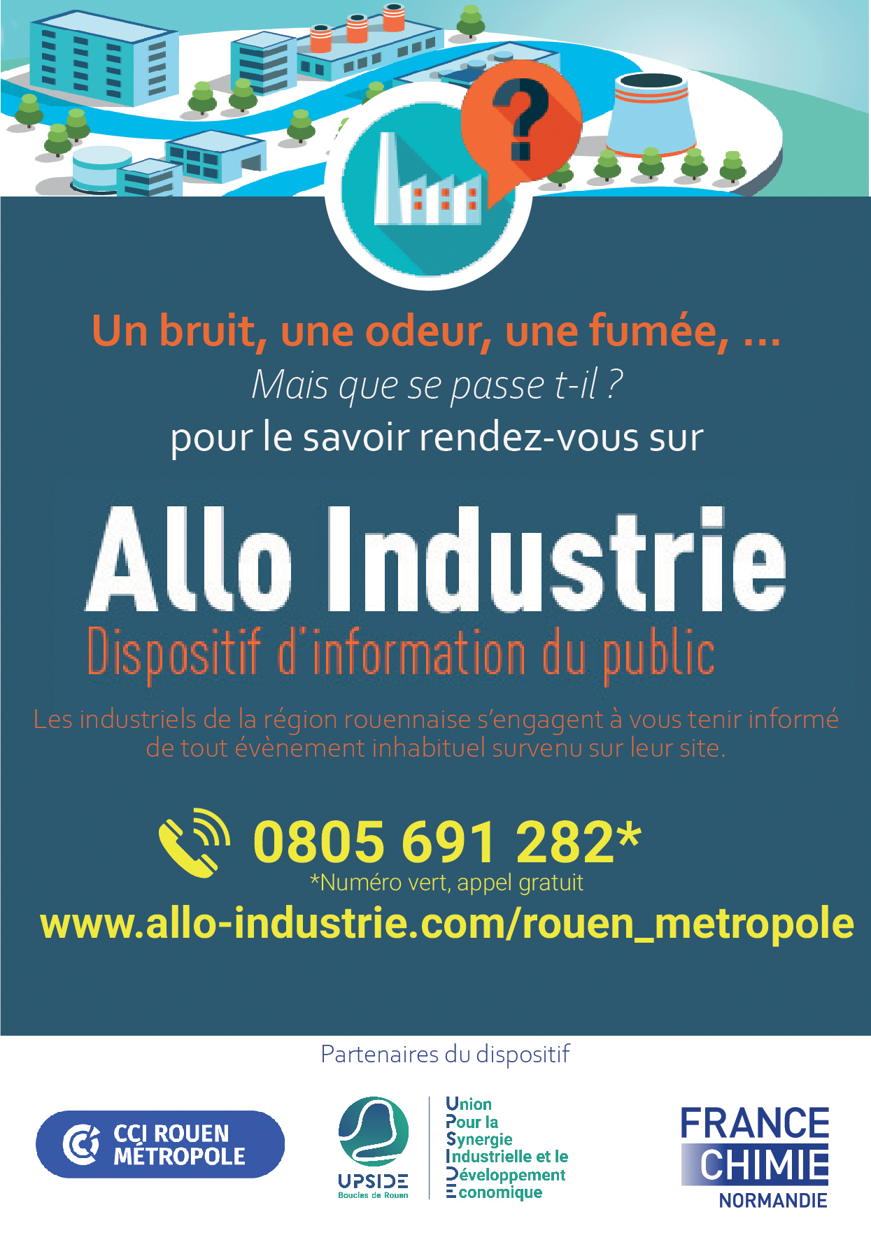 Si vous vous posez des questions en cas d’événement inhabituel (bruit, fumée, sirène, agitation aux abords d’un site industriel), consultez ALLO INDUSTRIE : en effet, les industriels adhérents à UPSIDE s’engagent à vous tenir au courant lorsqu’un évènement inhabituel se déroule sur leur site. Ils diffusent alors un message sur la plateforme Allo Industrie, message disponible sur le répondeur téléphonique (0805 691 282 - numéro vert).